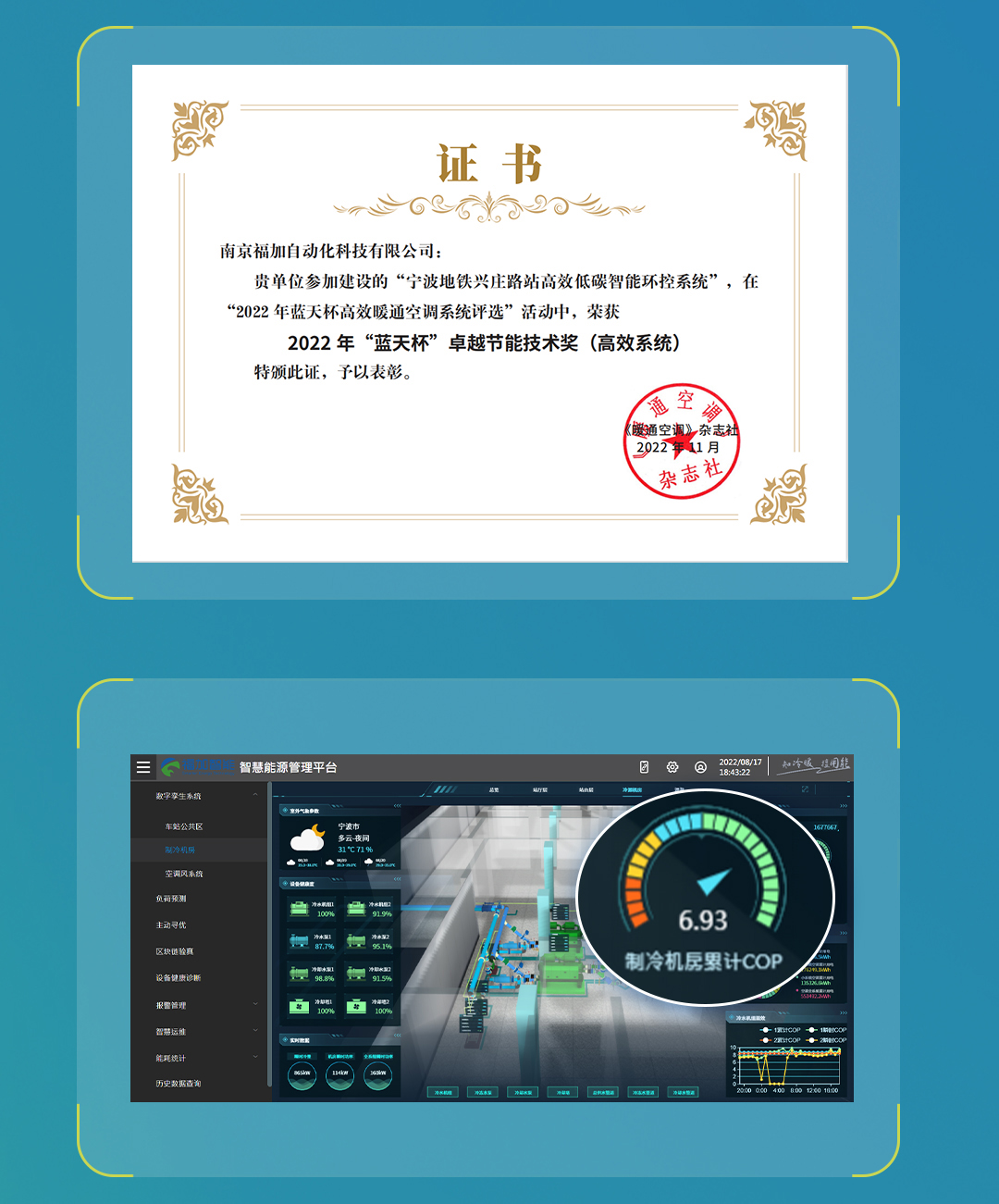 憑借寧波地鐵低碳智能環(huán)控系統(tǒng)項目超高指標(biāo)交付落地(機(jī)房綜合能效比達(dá)6.93),福加榮獲了卓越節(jié)能技術(shù)獎(高效系統(tǒng))。