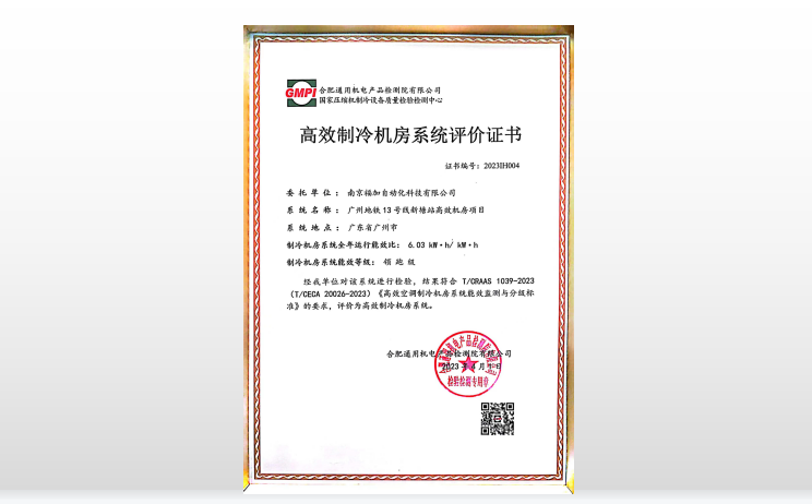 福加實施的廣州地鐵13號線新塘站高效機房系統(tǒng)(年均運行能效6.03)經(jīng)合肥通用機電產(chǎn)品檢測院有限公司檢驗,結(jié)果符合 《高效空調(diào)制冷機房系統(tǒng)能效檢測與分級標準》 的要求,評價為高效制冷機房系統(tǒng)。