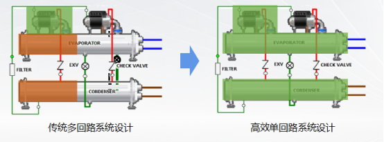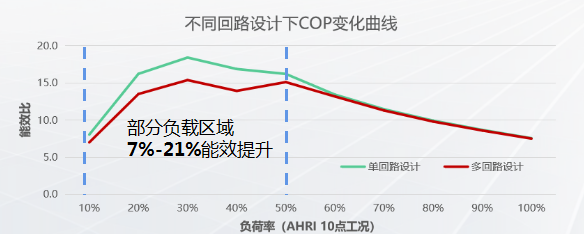 磁懸浮冷水機組采用高效單回路系統(tǒng)設(shè)計,較常規(guī)變頻螺桿冷水機組有7%-21%左右的能效提升。